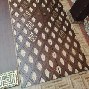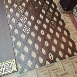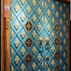 Dimension – 1440 mm width ; 2485 mm Height Material – 25mm aluminum frame border of square pipe (inside hollow space) mounted with 10 mm solid teak wood on both sides than metal handmade diamond design further decorated with brass hand carved flowers and other mounting amenities to match the door as per photo.