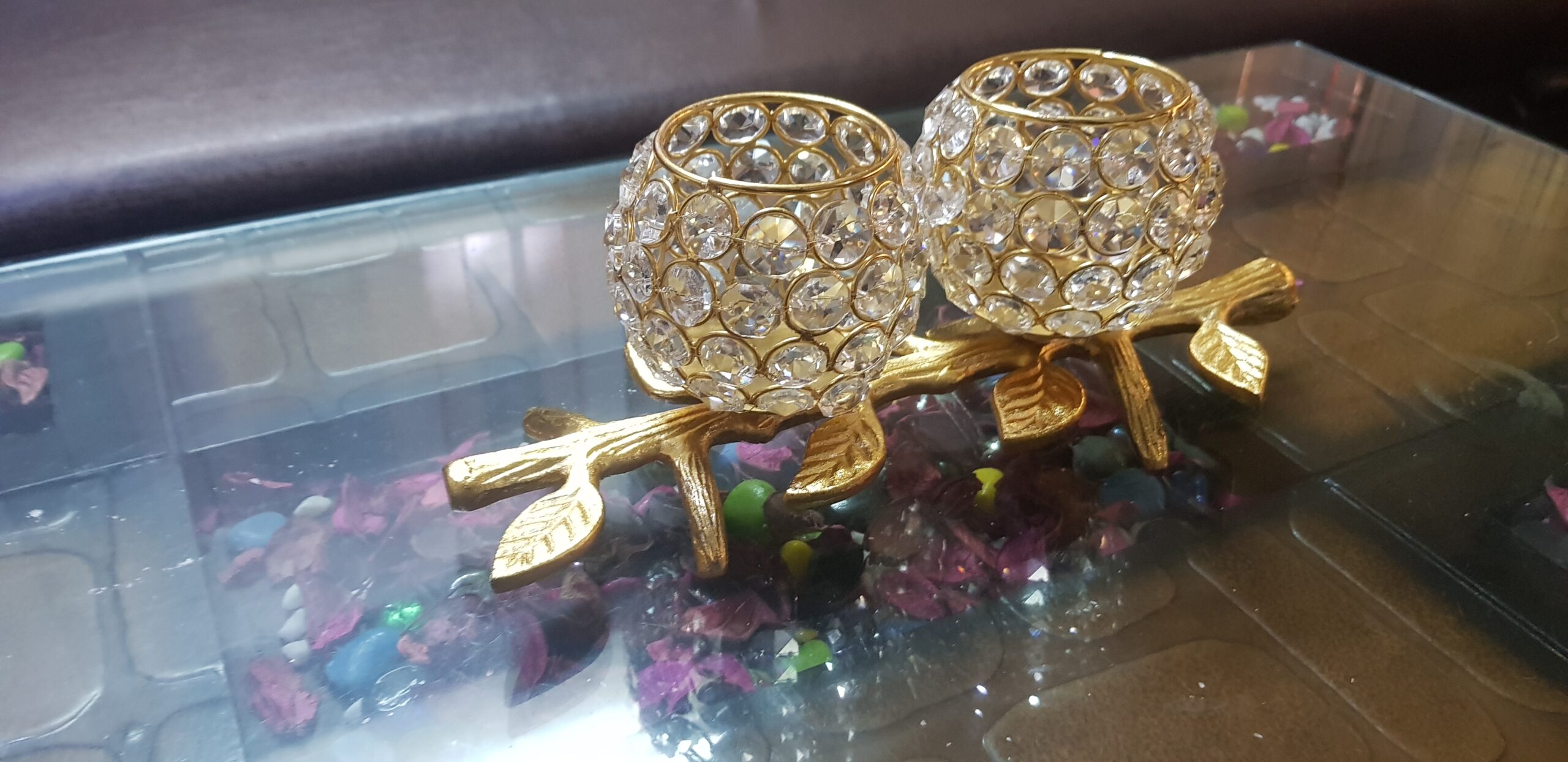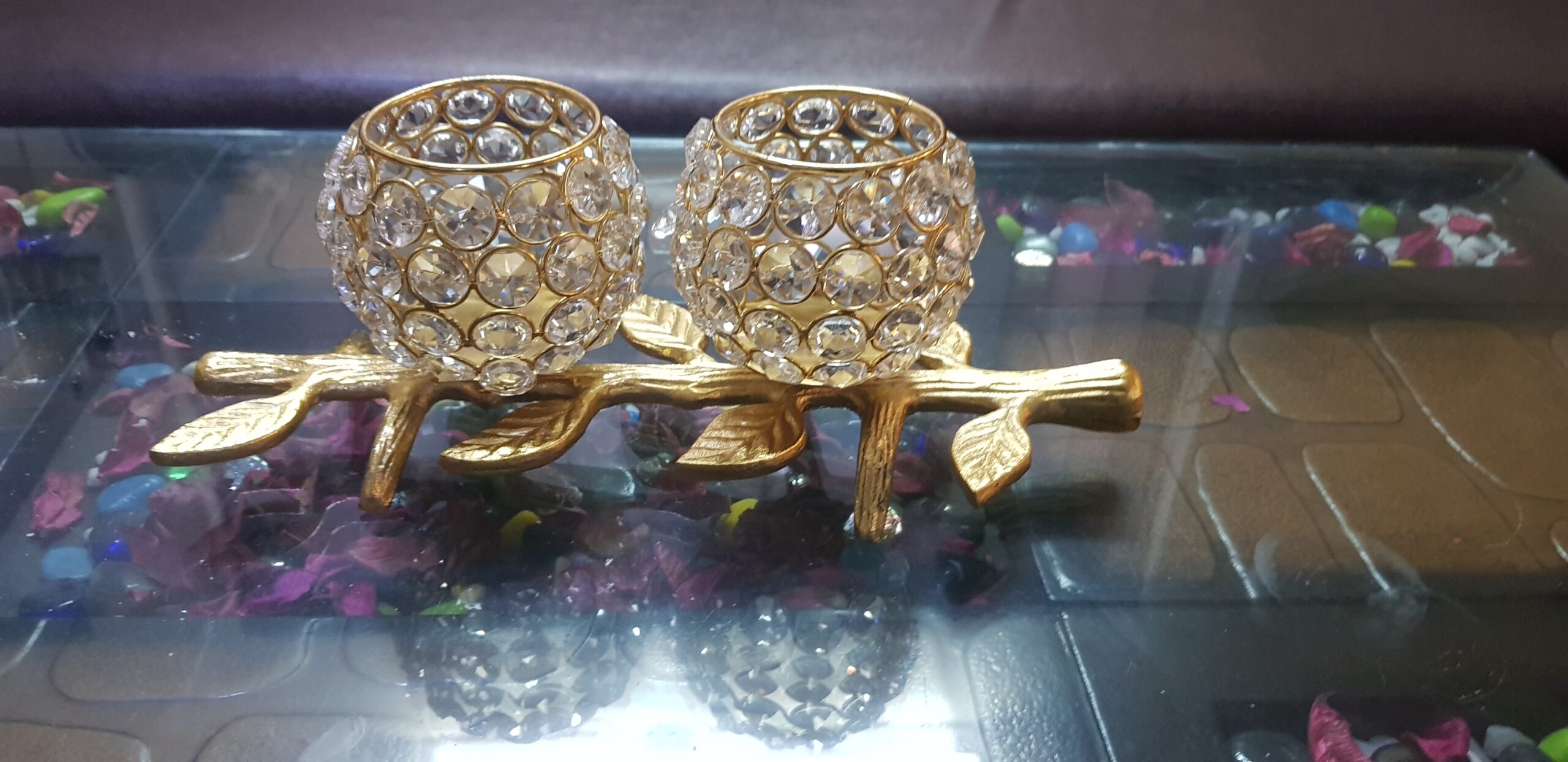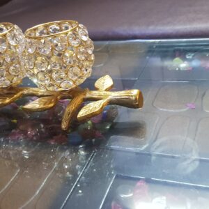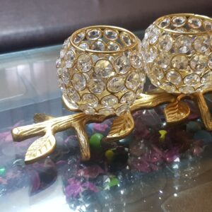 Description- Beautiful crystals embedded t-light candle stand, heart shaped with pedestal, golden finished.