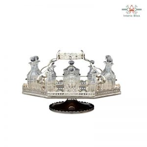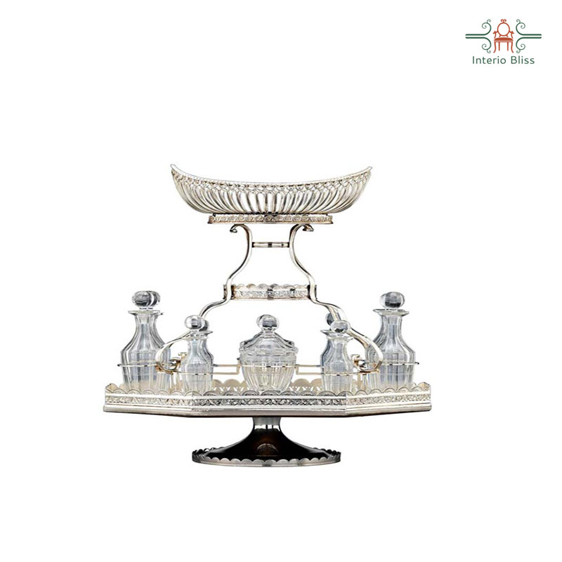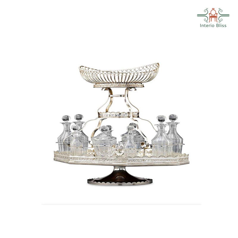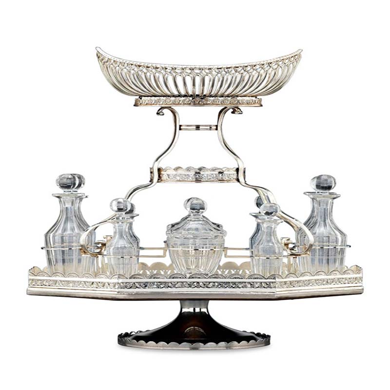 This elegant silver plate ornamental centerpiece for a dining table is a rarity in that it also includes a full, cut-glass cruet set. This delicate central basket is elevated above a plateau holding ten finely-cut bottles, including two mustard pots, four small vinaigrettes and four larger vinaigrettes. Intricate bright-cut engraving along the pierced galleries completes this stunning piece. The center basket can display flowers or exotic fruits. These multi-purpose pieces meant to facilitate a new dining style where guests helped themselves, rather than being served .