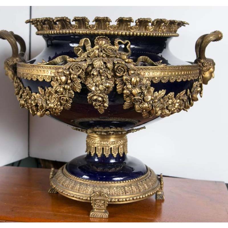 A center piece in porcelain  with bronze mounts and handles. Faces on the handles and swags of floral garlands.