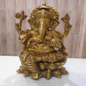 Ganesha Brass idol , in which ganesha is seen sitting on a lotus flower. The extreme fine hand carved traditional designs and tone finish of the idol , make it a best decor item in a pooja room, at any interior of house, office etc,for pooja (Ganesha vandanam) during the start of any new venture .