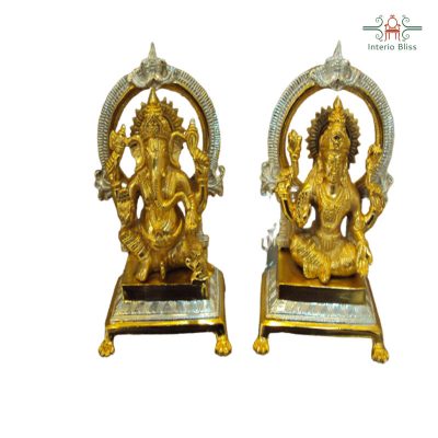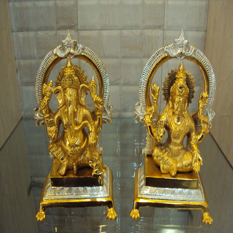 The goddess of wealth and the God of wisdom Ganesha together in this piece of decor. The white part in this idol is material brass electroplated with silver , which add extra beauty to the already present traditional designs extremely hand carved by our workers at the store.