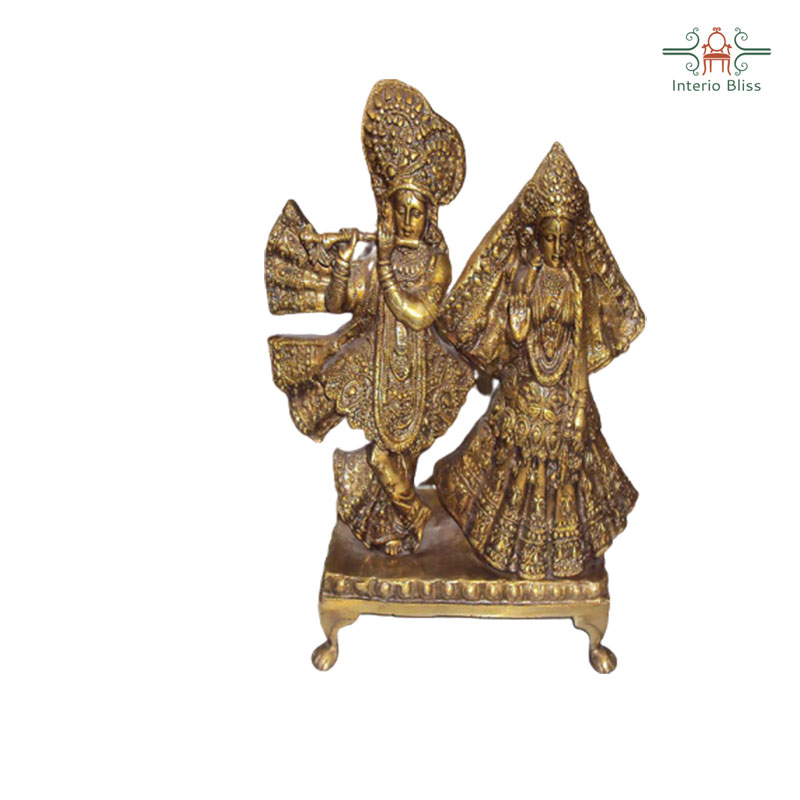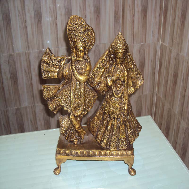 Radha-Krishna , The symbol of divine love. In this brass idol both are seen in traditional dress with a crown made of cloth on head and Krishna playing the flute and Radha deeply listening to it.