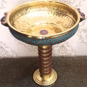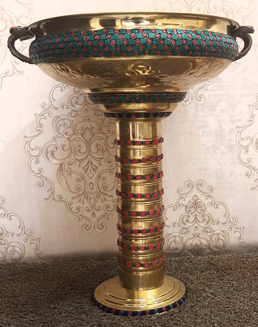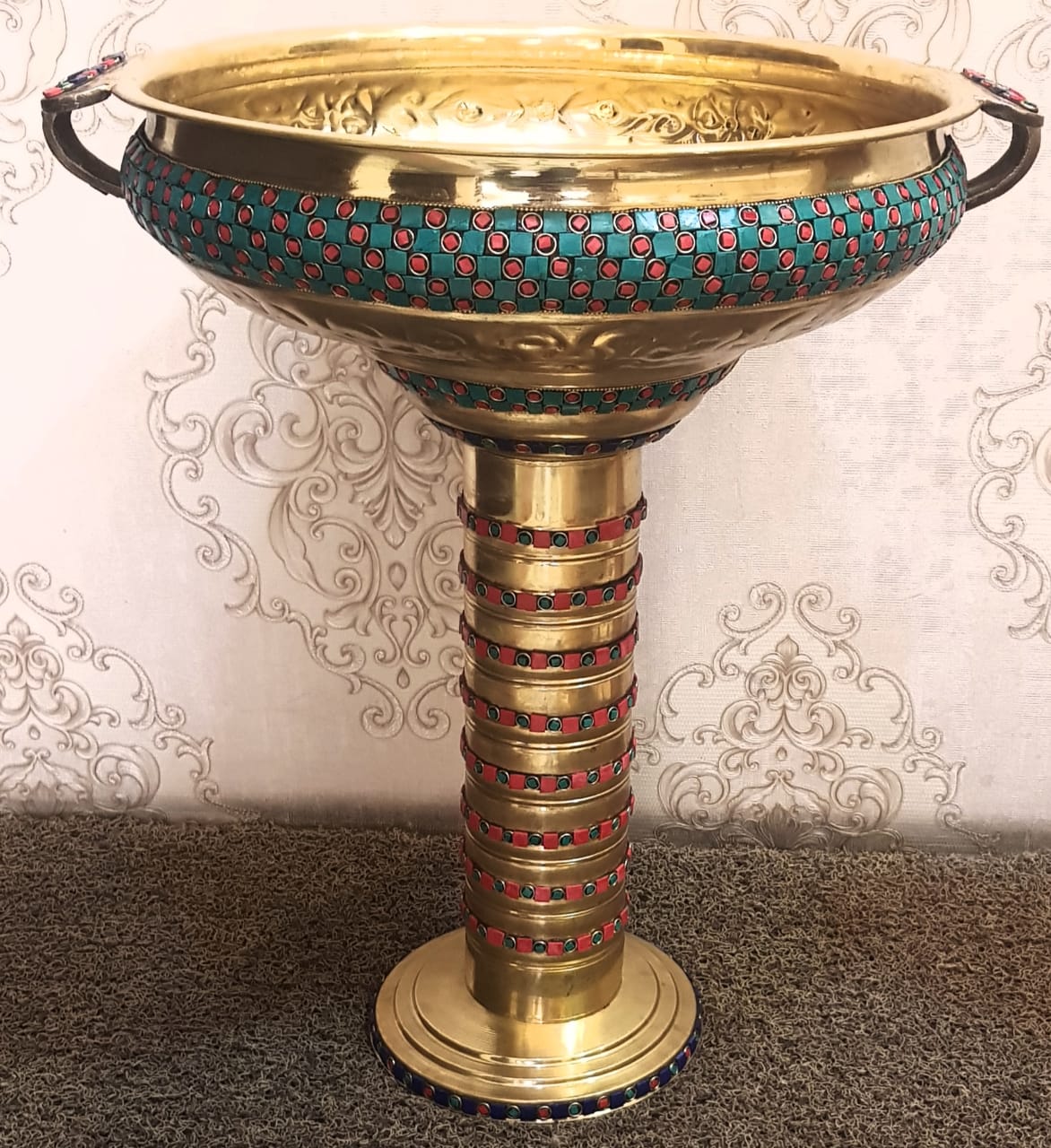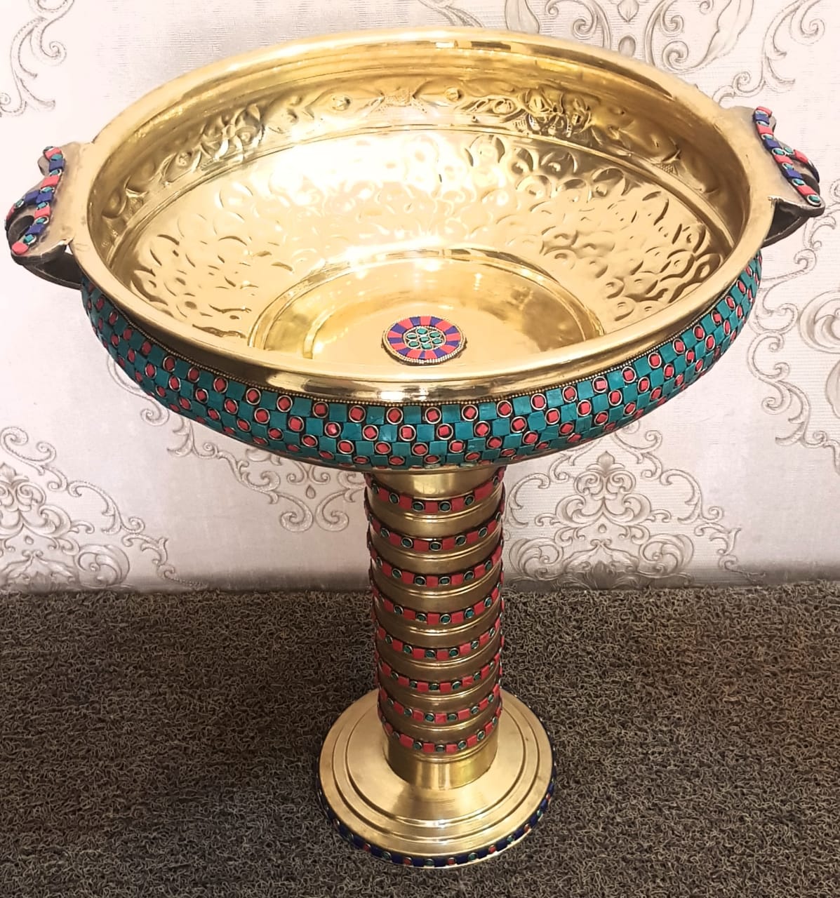 Description- Beautifully hand engraved big brass bowl (urli) with beautifully hand engraved detachable brass stand done with multi colored stone work. One can place rose petals with some water and floating t- light candles in the urli.