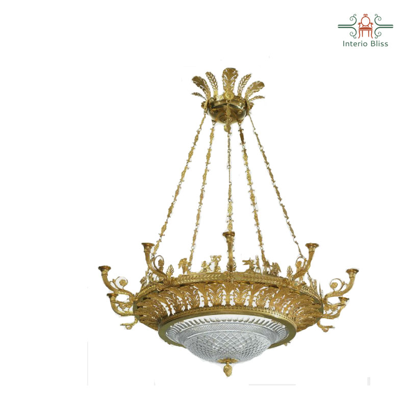 Article-Chandelier, exclusively carved, .Acrylic candle shaped holders included.Material-Aluminum, IronFinish – Golden finishedDimension-24” Length |