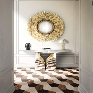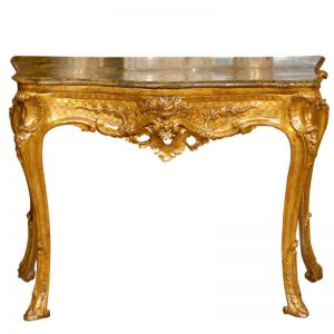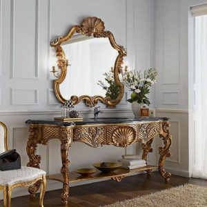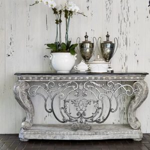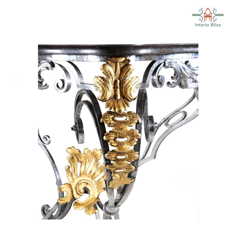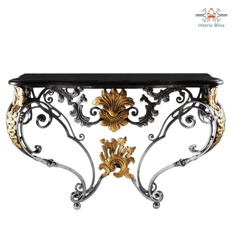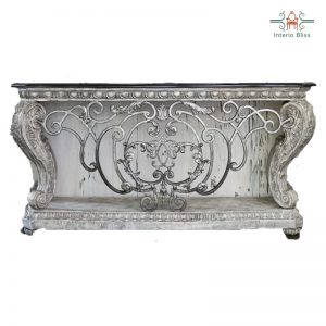 The two leged table made of metal with a straight edge at on side of the top and a curved side at the other edge gives a mix of classic and modern design.The top of the table is marble top Make your dream of making your room like a royal room with this antique designed console table.