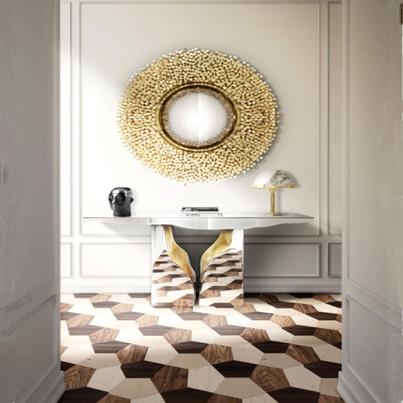 Two piece of rectangular pieces kept together to form the legs of the console table. The top of the table is a glass piece with soft edges. which is large enough to place your things.