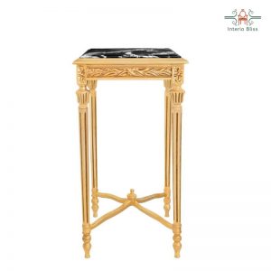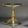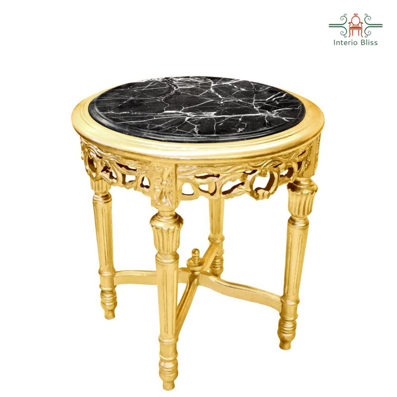 A circle table wityh black marble top , rising from circular toupie feet, the conforming legs conjoined by a carved cross stretcher having a central finial with a flambeau atop; a beutiful hand crasfted product from our store.