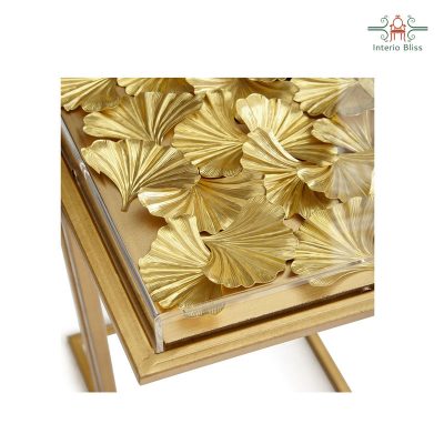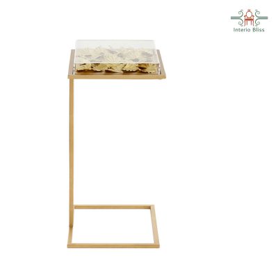 A corner table or vase stand or a end table, made in square shapes extremely for the new generation to fit in a new generation office space, studios, cowork spaces, restaurants, resorts etc.Made of metal with a square shaped glass top can be used to keep a flower vase, photo frames, essentials at an easy reach. Inside the glass the golden color leaf are place forr attraction.