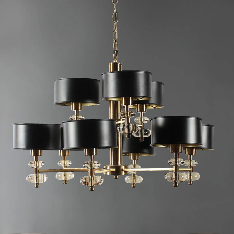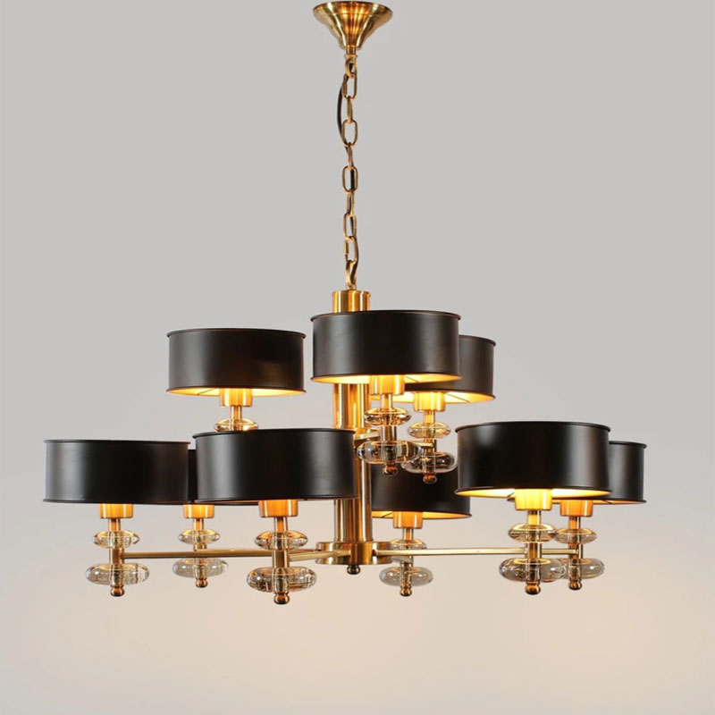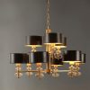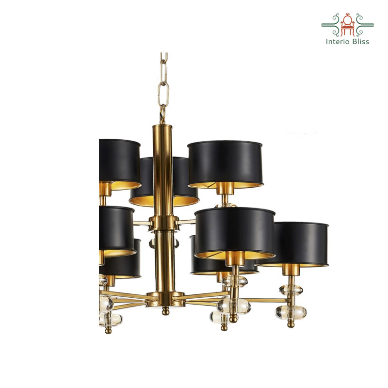 This chandelier comes with fabric shades in solid black and a sleek metal body finished in an antique distressed golf leaf finish for sheer opulence. The gold leaf finish is a very unique and one of kind textures given to metal. Very fine sheets of gold or silver are gilded onto the surface. It is a texture that’s delicate but impervious to chemicals and does not tarnish.
