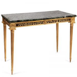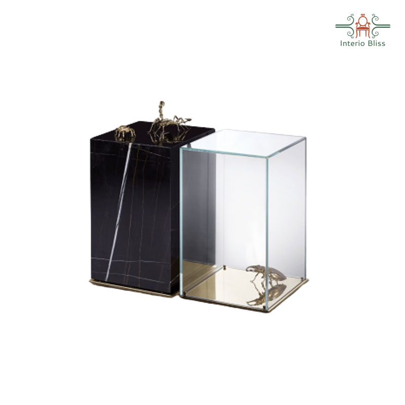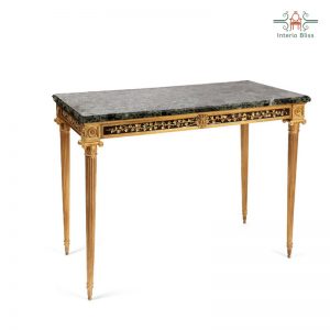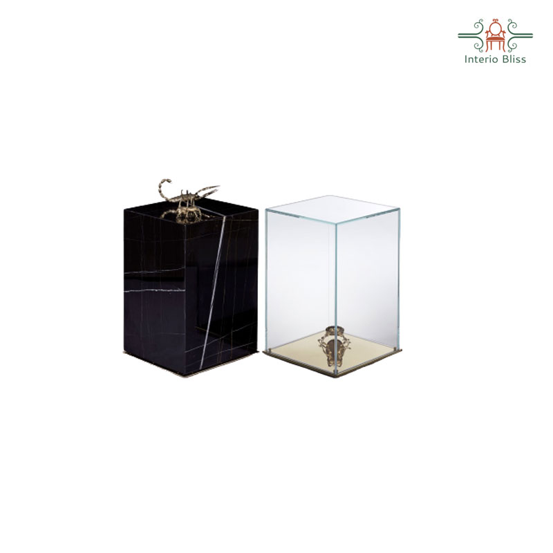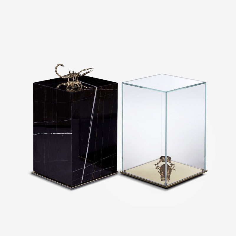 The center table is composed by two fragments, finished in mirror and noble marble and beautified by the presence of golden creatures that are prepared for beauty.