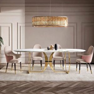 with natural marble in round and smooth corners and material metal/ stainless steel leg coated with golden colour