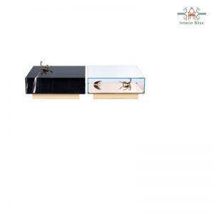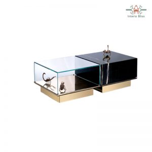 A set of two tables. One module is composed of a glass box which envelopes 3 gold plated elements of 2x scorpion and 1x pollock beatle, laying in a base of gold plated brass. The second module is composed of marble box over wood structure, gold plated base.