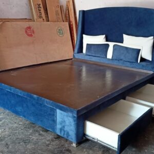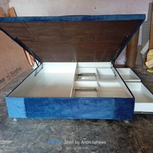 Fully upholstered exterior of bed and back with velvet blue fabric and white laminate inside the storage.