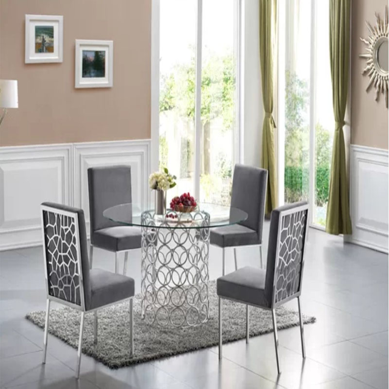 The legs of the dining table are sturdy in nature and can withstand the weight put on it. Chairs have beautiful designs which are another significant advantage of having this dining set in your house.The perfect design for your home casual dining space: mixing a contemporary design with Classic comfort, This dining table Set will look great in your kitchen or dining room. The table top is circular tempered glass.