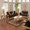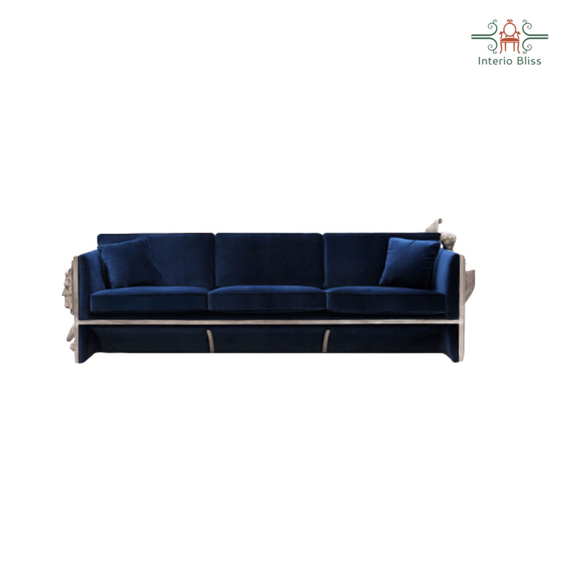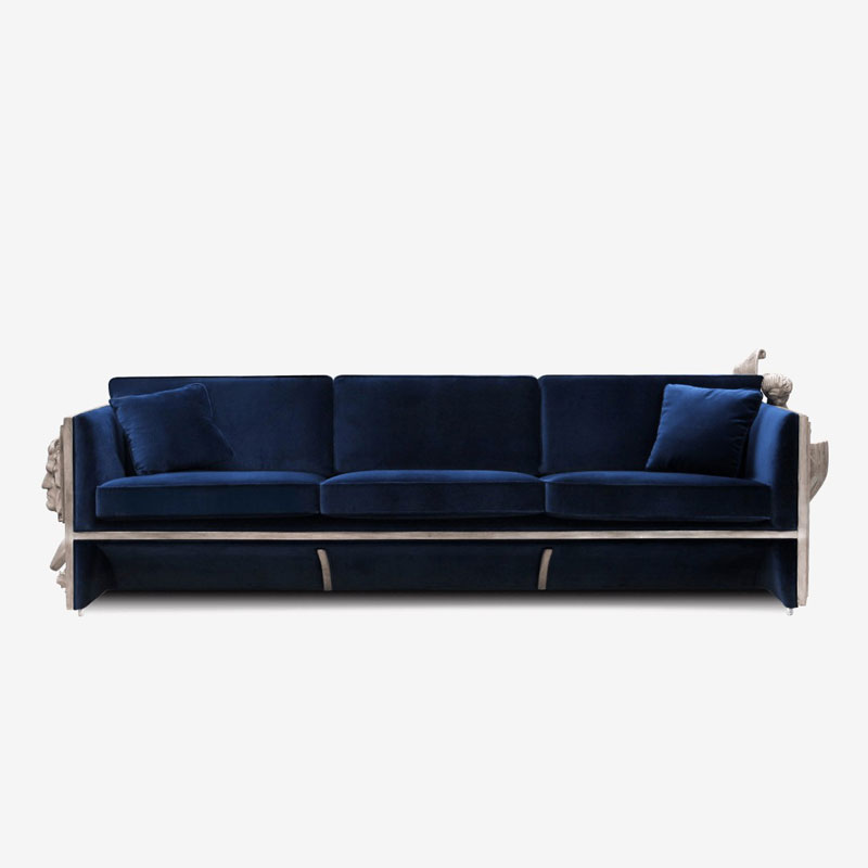Blue royal Sofa made in a wood structure and panels in a manual sculpture, produced in resin and finished with restoration techniques similar to stone. The upholstery fabric is made up of six velvety and removable pillows. The legs are produced in acrylic turned.