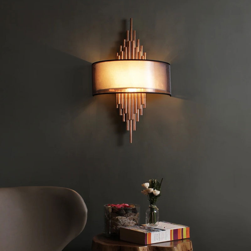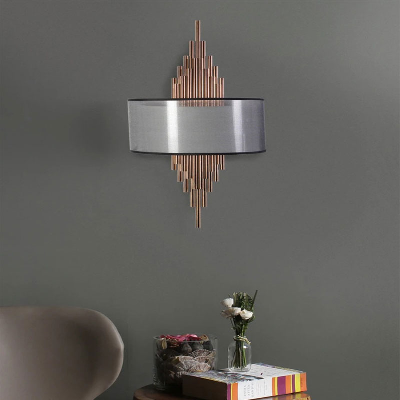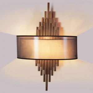 Modern style wall mounted wall lamps with a lighting area of 3-5 meters in fabric shade type, and shadow direction down having a knob switch. The body material is made of glass and metal brass.