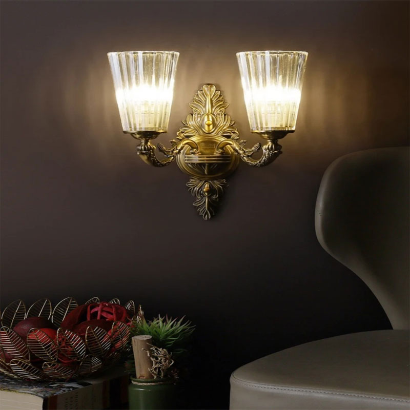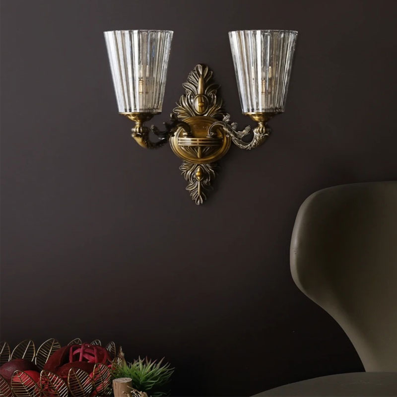 Modern style wall mounted wall lamps with a lighting area of 3-5 meters in fabric shade type, and shadow direction down having a knob switch. The body material is made of glass and metal brass.