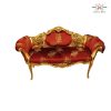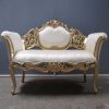 A love seat in blush with tufted upholstery and gold gilded ornate frame.