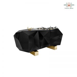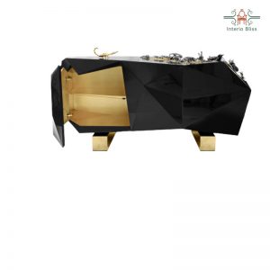 The sideboard also features three highly sculptured doors leading to a gold leaf interior with a shelf and two drawers.MATERIALS used in this product are Hammered brass, gold leaf, black lacquered wood, polished and casted brass.