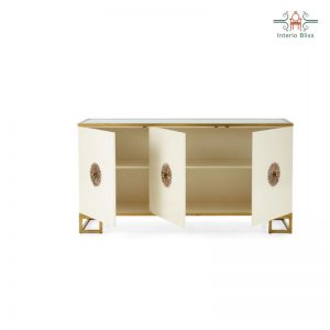 An indispensable piece of modern marvel with its contemporary design featuring white lacquer with a gold stainless Steel trim and base. Open the doors to reveal a large area that’s suitable for storing everything from serving bowls to out-of-season dinnerware.